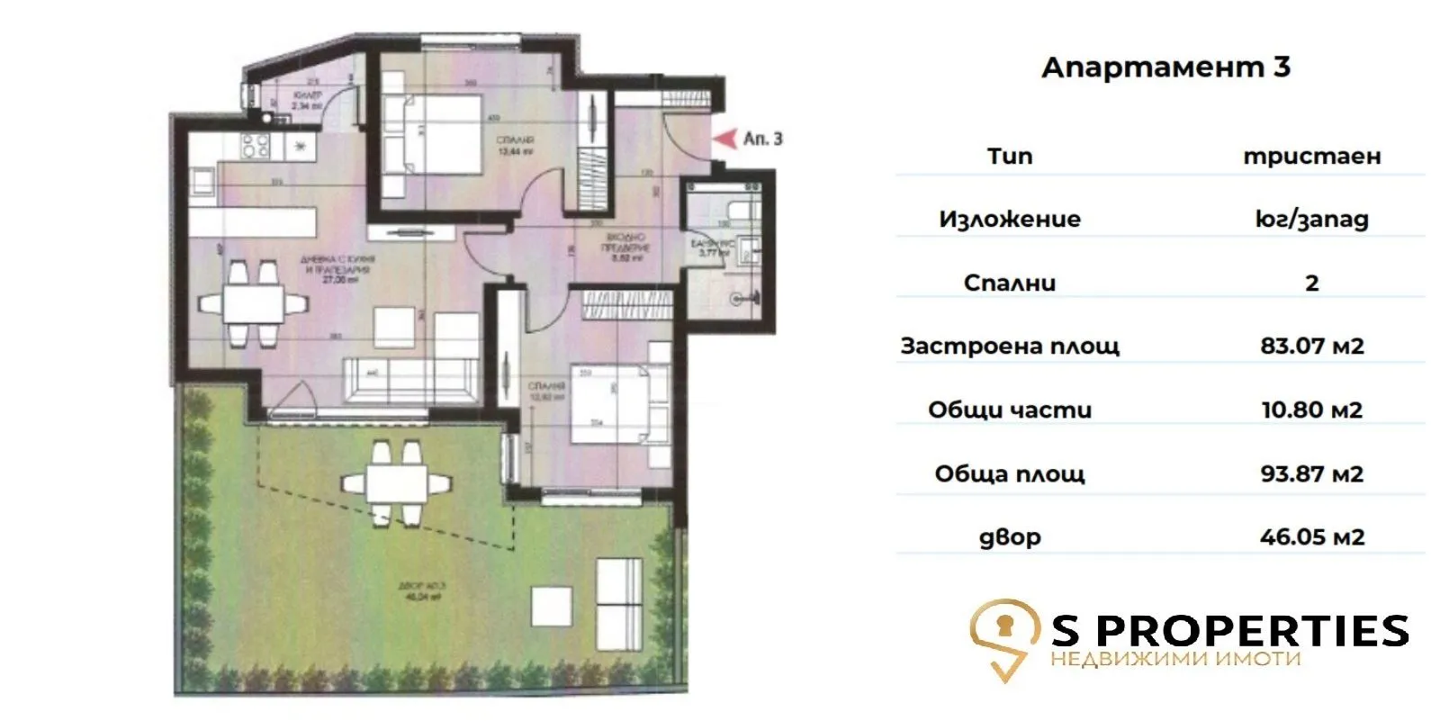 - **Обща площ**: 94,00 кв.м, която предлага удобство и простор.