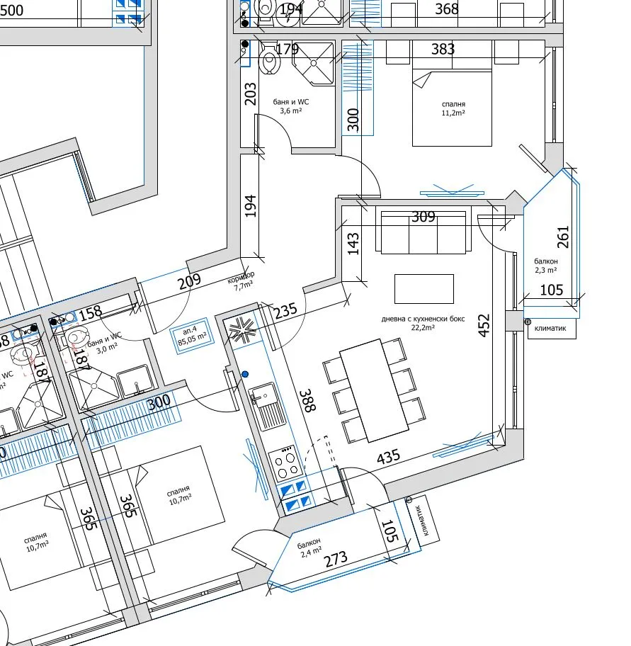 • Дневна – 22,20 подходяща за обособяване на кухненски бокс, трапезария и зона за отдих с излаз на тераса 2,30 кв