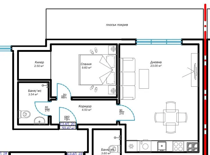 • Дневна – 23,20 подходяща за обособяване на кухненски бокс, трапезария и зона за отдих