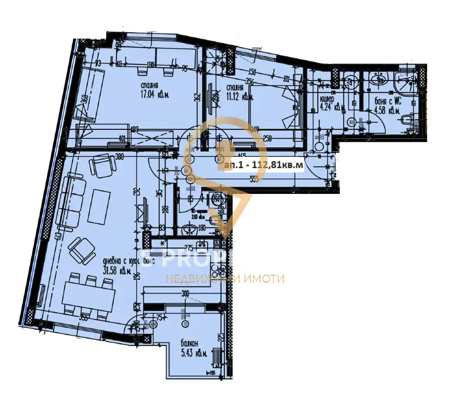 Жилището се състои от дневна с кухня 31 кв.м, спалня 17 кв.м, спалня 12 кв.м, баня с тоалет и перално, второ мокро помещение, тераса.