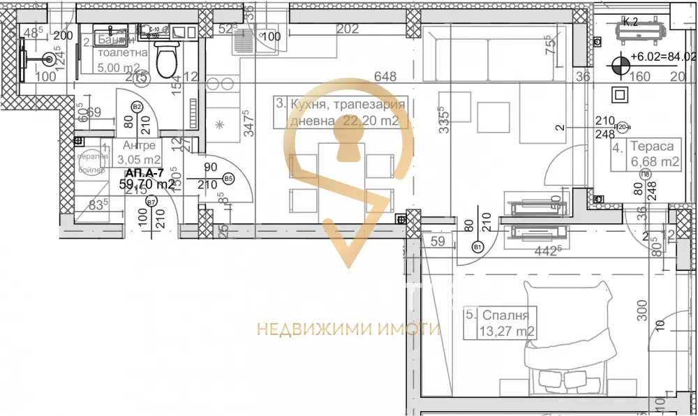 Жилището се състои от дневна с кухня 23кв.м, спалня 13кв.м, тераса и баня с тоалет.