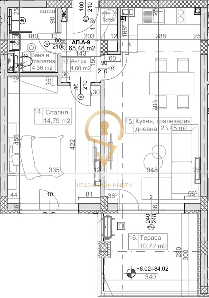 Жилището се състои от дневна с кухня 24кв.м, спалня 15кв.м, тераса 10кв.м и баня с тоалет.