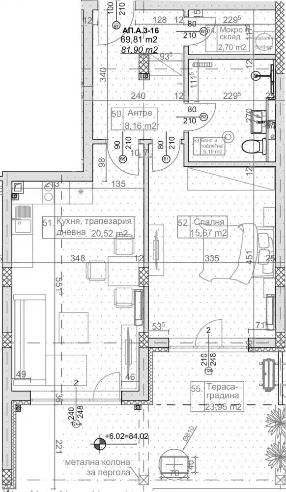 Жилището се състои от дневна с кухня 21кв.м, спалня 16кв.м, тераса-градина 24кв.м и баня с тоалет.