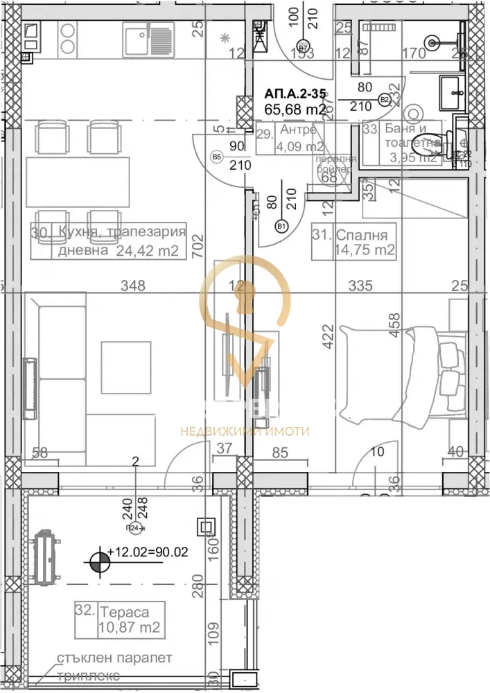 Жилището се състои от дневна с кухня 24кв.м, спалня 15кв.м, тераса и баня с тоалет.