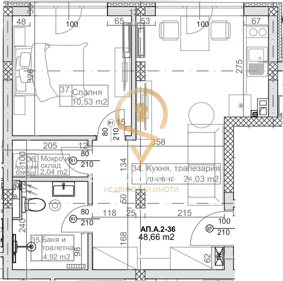 Жилището се състои от дневна с кухня 24кв.м, спалня, тераса и баня с тоалет.