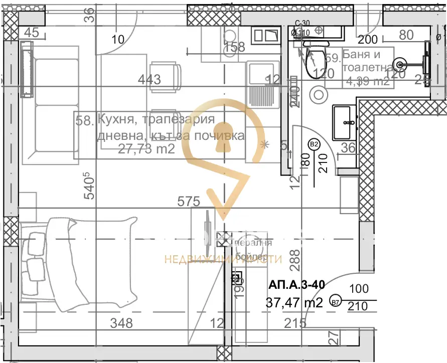Жилището се състои от дневна стая 27кв.м, баня с тоалет и коридор.