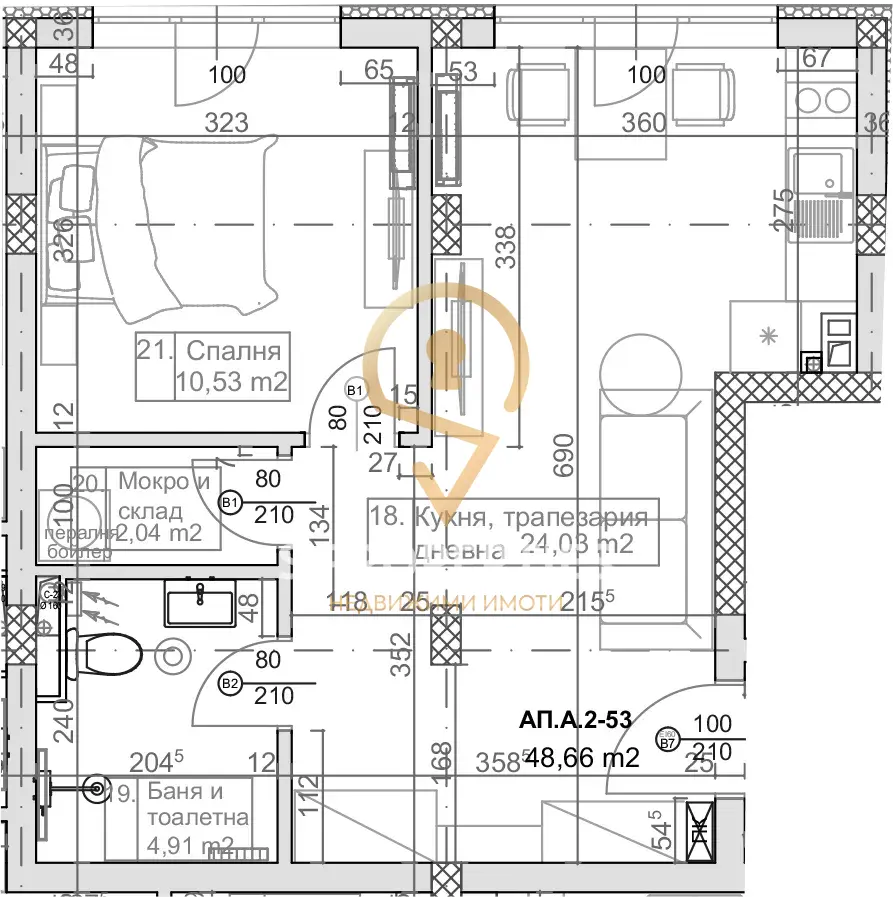 Жилището се състои от дневна с кухня 24кв.м, спалня и баня с тоалет.