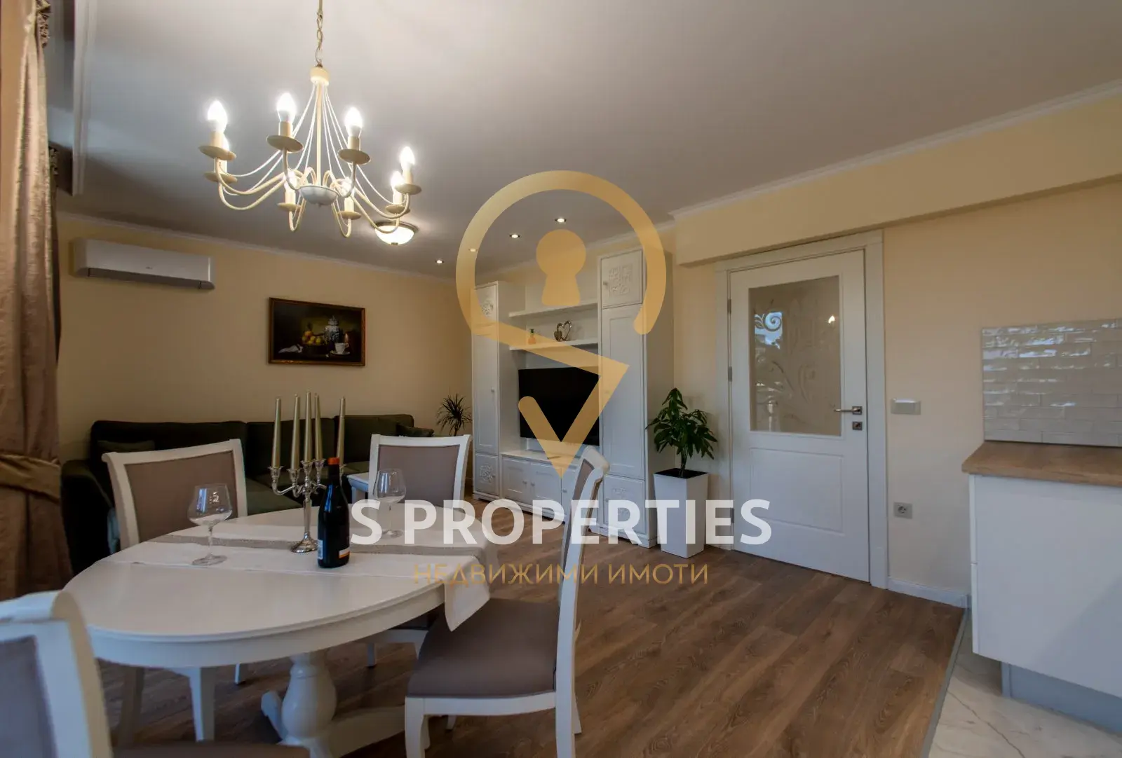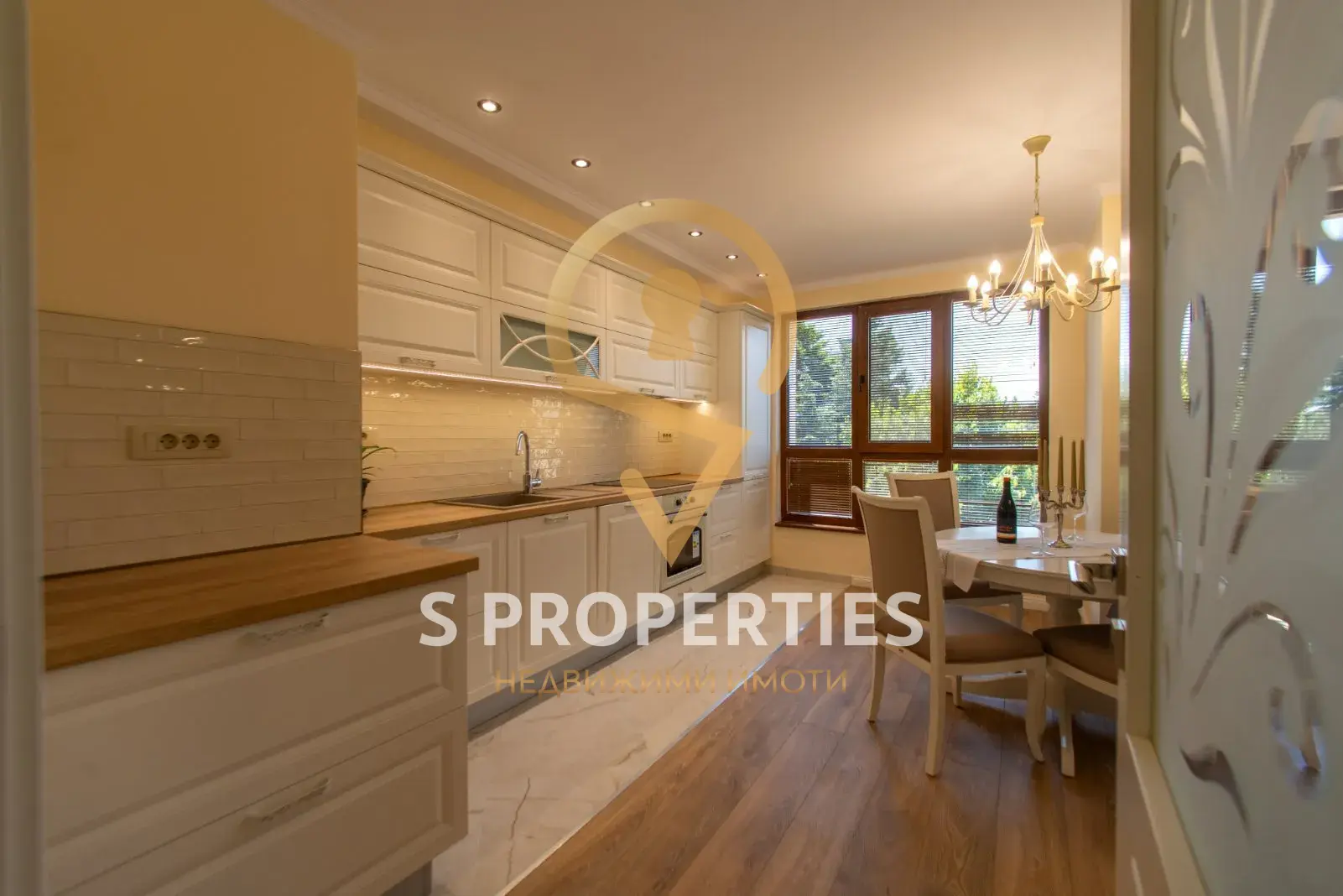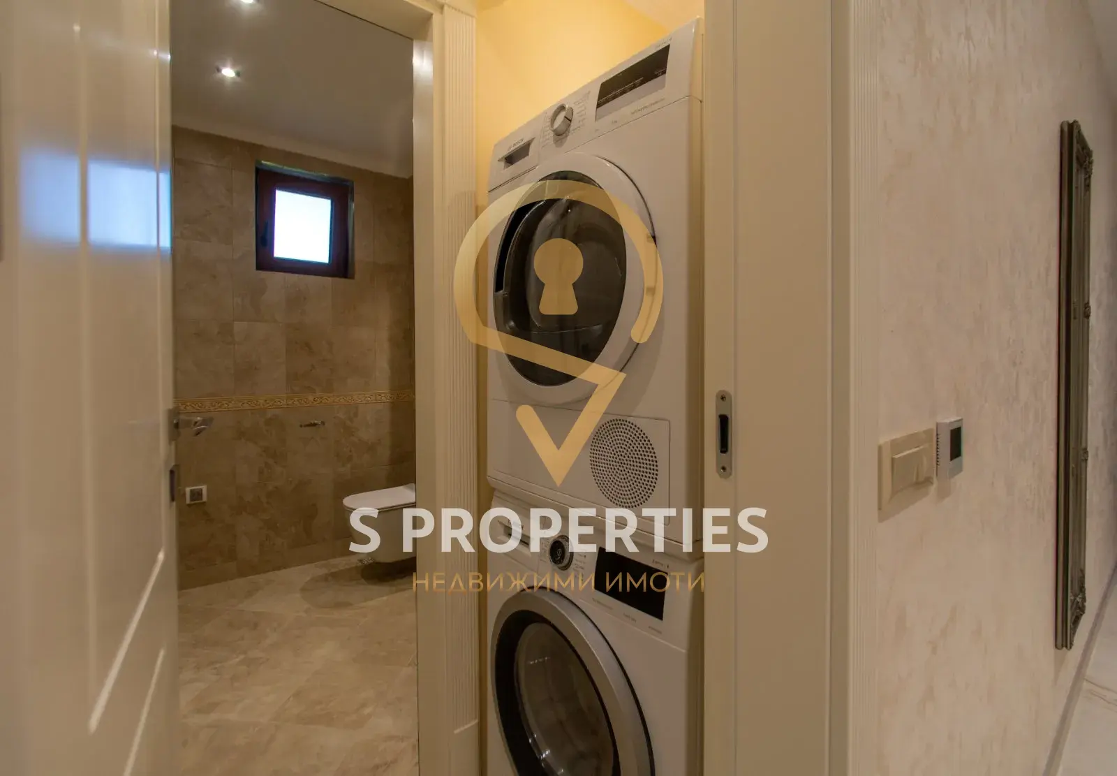 Имота е оборудван с миялна машина, сушилня и всичко нужно за едно домакинство, електроуредите са от най-висок клас, обзавеждането е бутиково, а цялостното изпълнение, по италиански проект с дизайнерски мебели от масив.