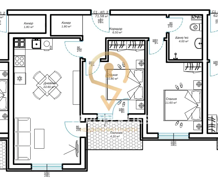Просторен тристаен апартамент, състоящ се от дневна с кухненски бокс, две спални, баня с тоалетна (или две санитарни помещения – според разпределението), коридор и тераса/тераси.