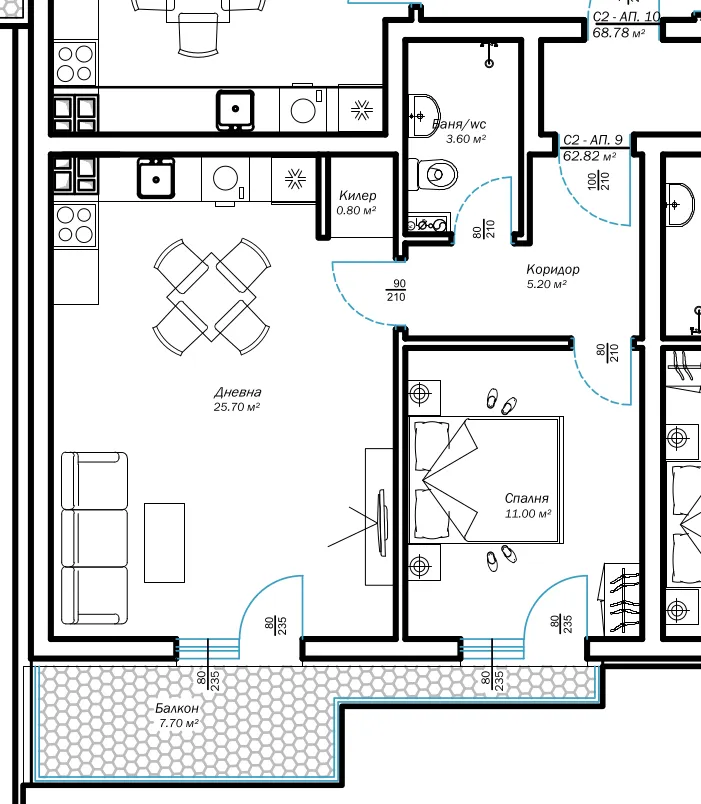 Функционален двустаен апартамент, състоящ се от дневна с кухненски бокс, спалня, баня с тоалетна, коридор и тераса. Жилището е с правилни форми и удобно разпределение, подходящо както за живеене, така и за инвестиция.