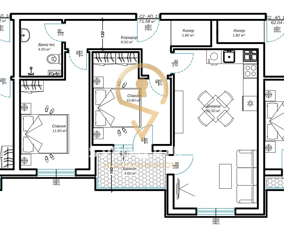 Просторен тристаен апартамент, състоящ се от дневна с кухненски бокс, две спални, баня с тоалетна (или две санитарни помещения – според разпределението), коридор и тераса/тераси.