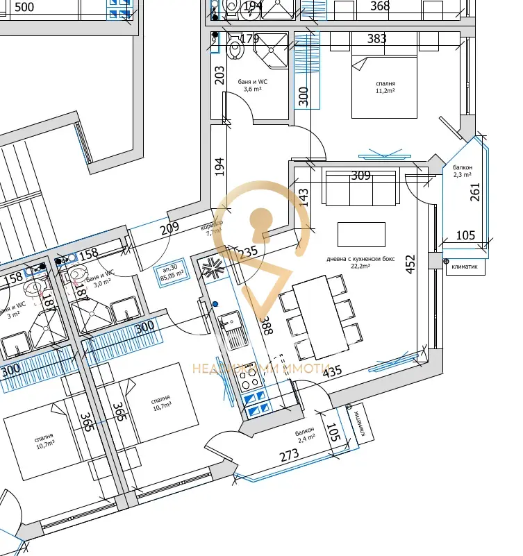 Просторен тристаен апартамент, състоящ се от дневна с кухненски бокс, две спални, баня с тоалетна (или две санитарни помещения – според разпределението), коридор и тераса/тераси.