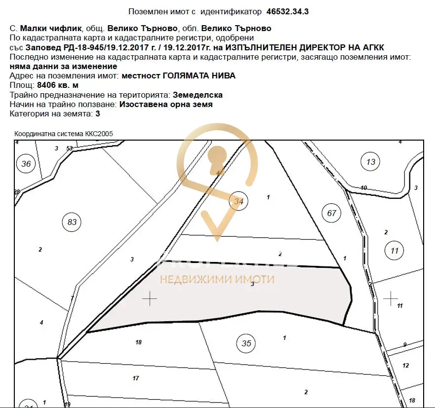 4. Поземлен имот 46532.34.3, община Велико Търново, с. Малки чифлик, м. ГОЛЯМАТА НИВА, Земеделска, категория 3, НТП Изоставена орна земя, площ 8406 кв. м, стар номер 034003.