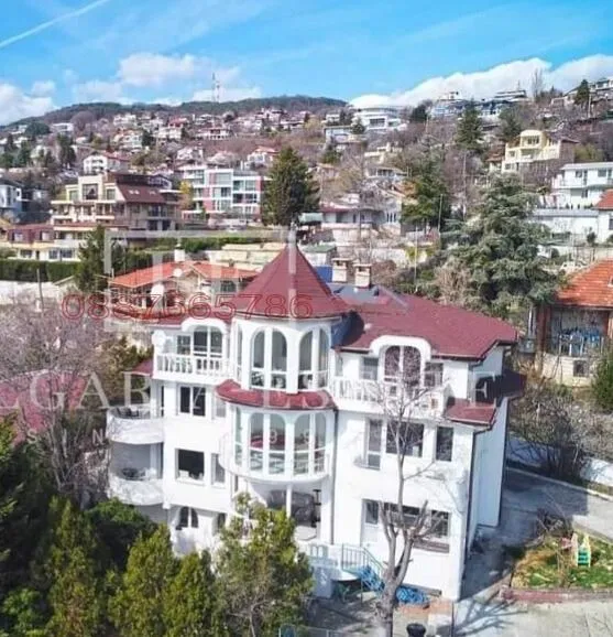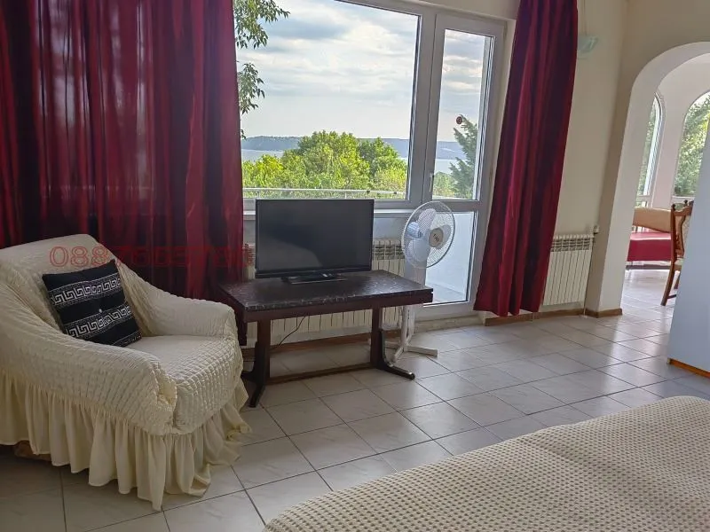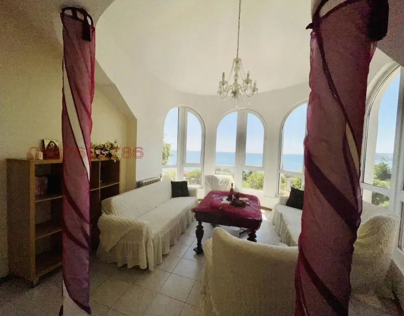 580 кв.м, 4 ет., Представяме ви къща с невероятна морска панорама. Намира се на втора линия над магистралата в тихо и закътано място. Дворът е 760 кв.м., а РЗП - 580 кв.м. Къщата се откроява с рядка за района архитектура, която е в пълна хармония с морския пейзаж - бяла фасада, арки, колони, веранди.
