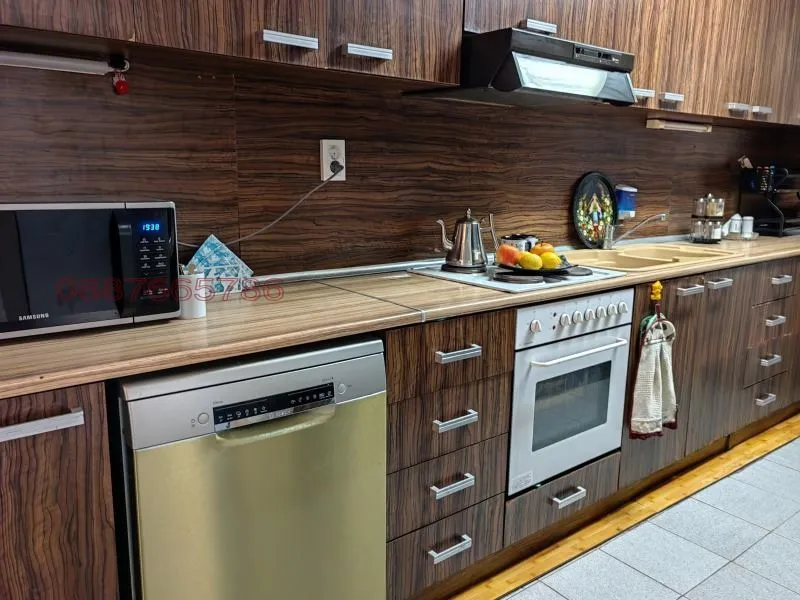 На първия етаж се намира оборудвана кухня с голяма трапезария с миалня; зимна градина; мокро помещение, котел на ток, втори котел на дърва и въглища и 200 литров бойлер; друго; складово помещение за хранителни продукти и с монтирани рафтове по стените, складово помещение за инструменти, перално помещение. Този етаж е 206 кв.м. и там са разположени 3 помещения, които могат да бъдат приспособени за фитнес, кабинети или сауна, тъй като са с прилежащи WC.