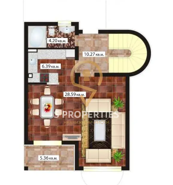 - Дневна: Широка и добре осветена, дневната зона е идеална за семейни събирания и релаксация. Големи прозорци осигуряват изобилие от естествена светлина създават уютна атмосфера.