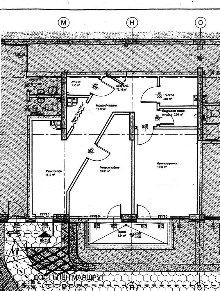 Въз основа на изготвен проект помещението е разпределено по следния начин- регистратура, чакалня, лекарски кабинет, манипулационна, помещение за опасен отпадък, АУСГУС, тоалетна и кухненски бокс. Пред кабинета има обособена площ където може да се сложат маса и столове!