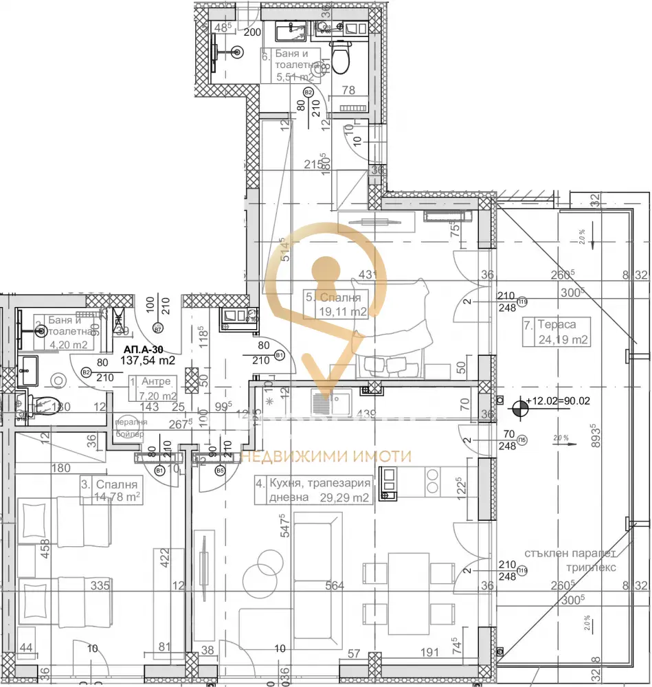 Жилището се състои от дневна с кухня 29кв.м, спалня 19кв.м със собствена баня, спалня 15кв.м, баня с тоалет и тераса-градина 24кв.м.