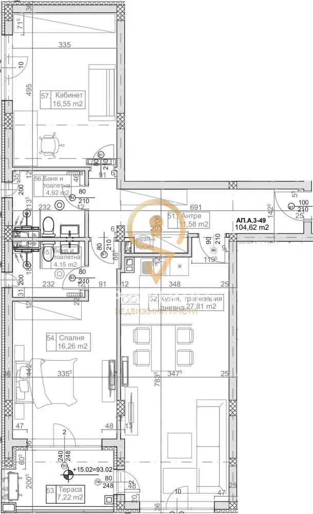 Жилището се състои от дневна с кухня 27кв.м, две спални по 16кв.м, две бани с тоалет и панорамна тераса.