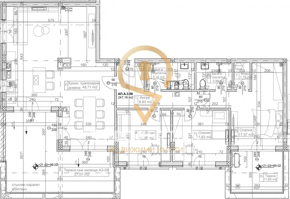 Жилището се състои от дневна зона с кухня 49кв.м, три спални, едната от които със собствена баня, втора баня с тоалет, перално помещение, две големи панорамни тераси.