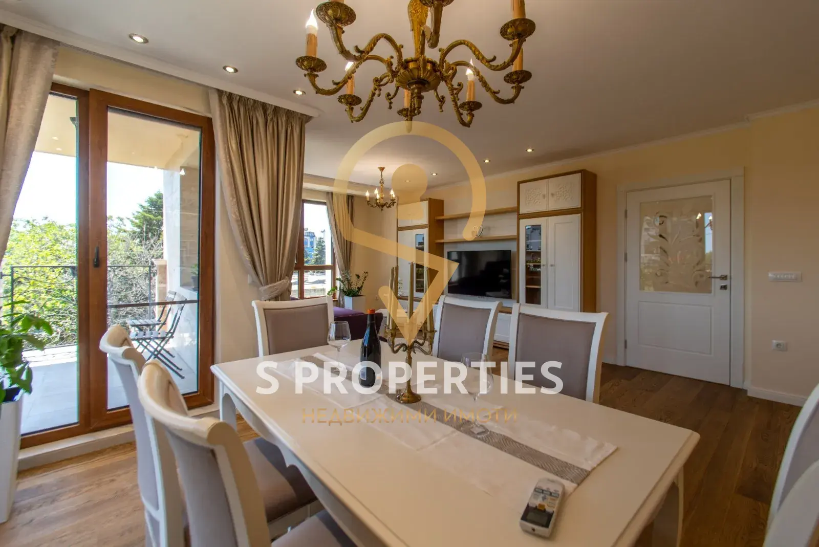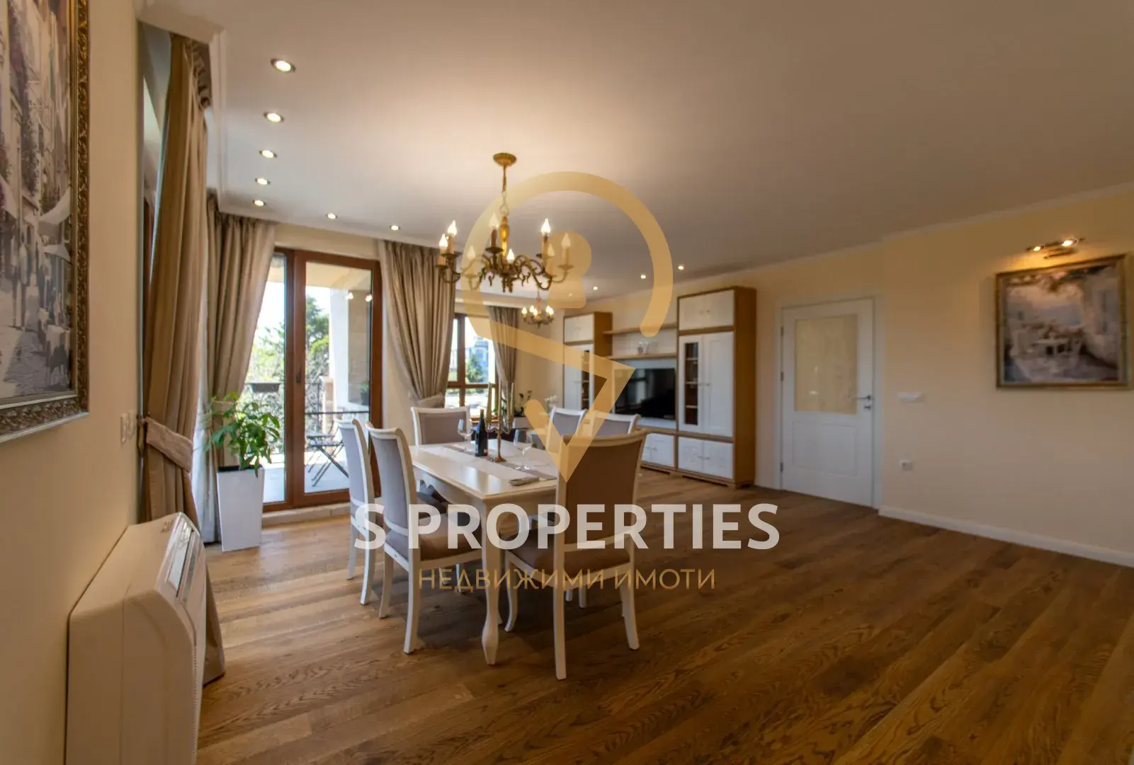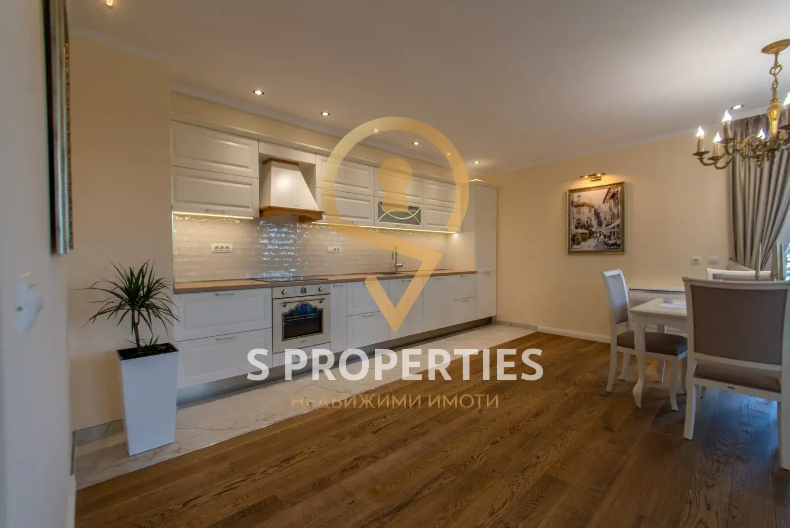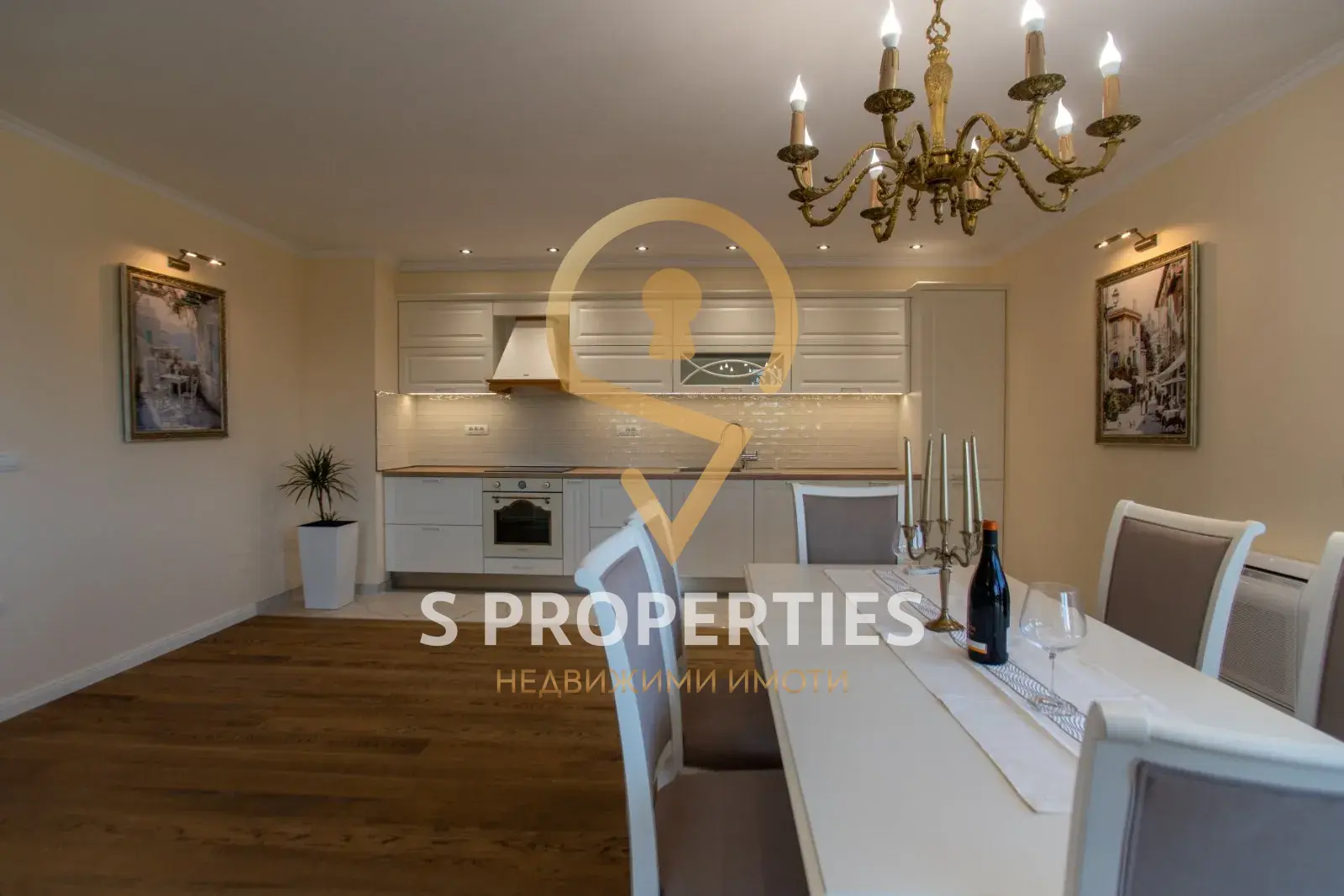Имота е оборудван с миялна машина, сушилня и всичко нужно за едно домакинство, електроуредите са от най-висок клас, обзавеждането е бутиково, а цялостното изпълнение, по италиански проект с дизайнерски мебели от масив.