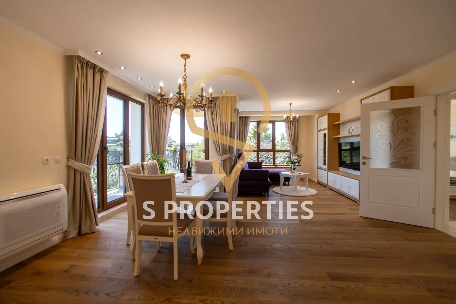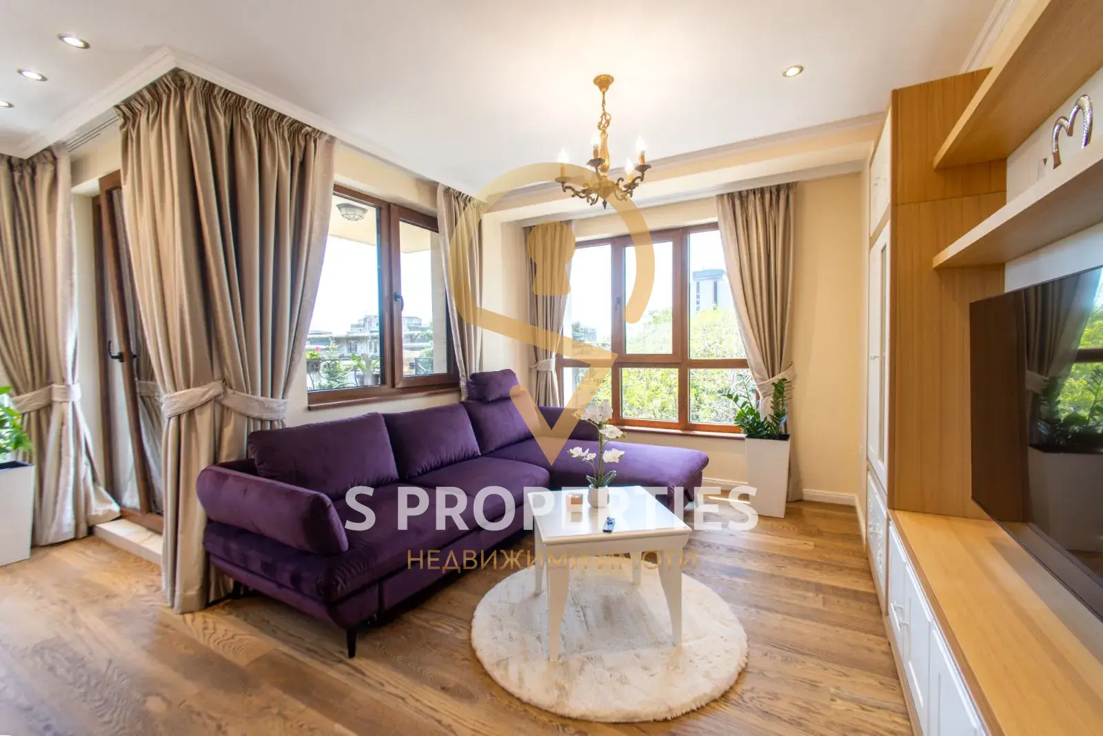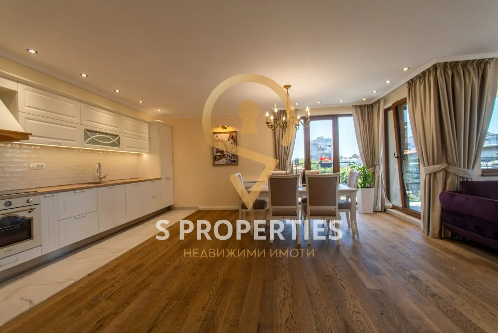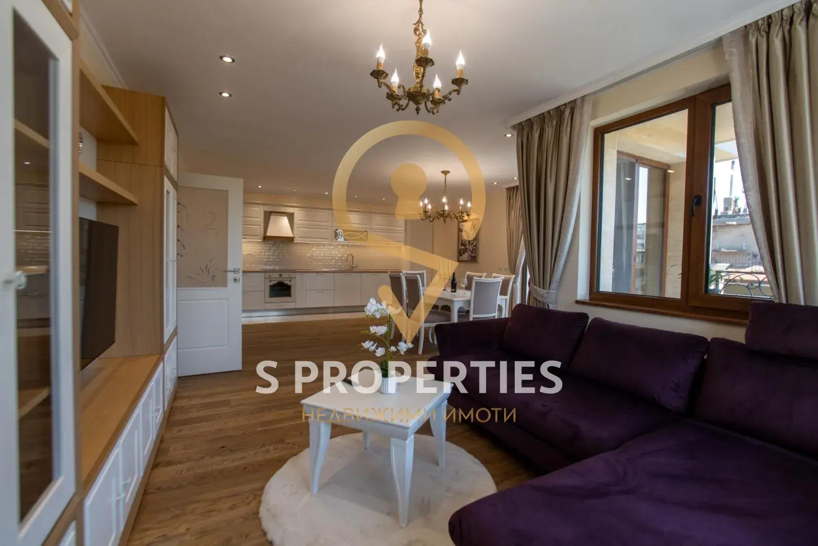 Имота е оборудван с миялна машина, сушилня и всичко нужно за едно домакинство, електроуредите са от най-висок клас, обзавеждането е бутиково, а цялостното изпълнение, по италиански проект с дизайнерски мебели от масив.