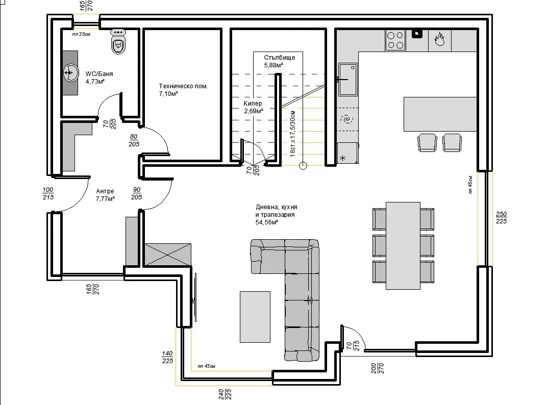 • Просторна дневна с кухня и трапезария – 55 кв.м
